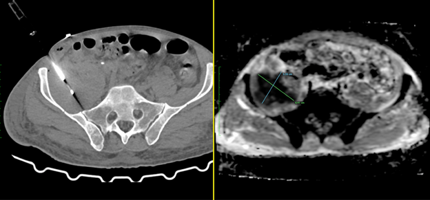CT-guided right iliopsoas mass biopsy in supine position under local anesthesia.